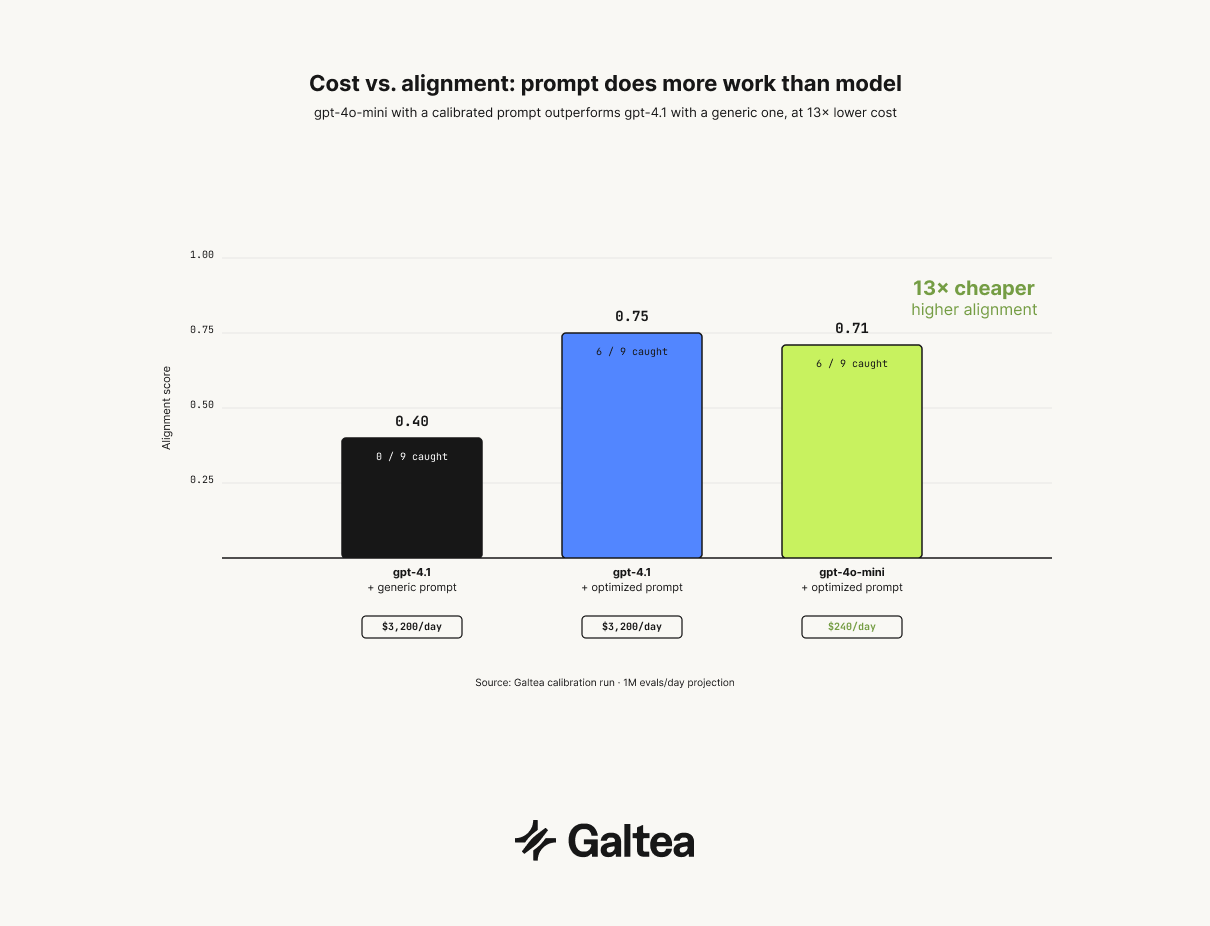 The prompt is doing more work than the model. gpt-4.1 with a generic prompt is not a substitute for a calibrated prompt on GPT-4o-mini; it's the wrong tradeoff. If your judge runs on every production response, deploy the calibrated, cheaper model. At 0.71 alignment, it outperforms the default configuration on every metric that matters, and the cost difference compounds at scale.