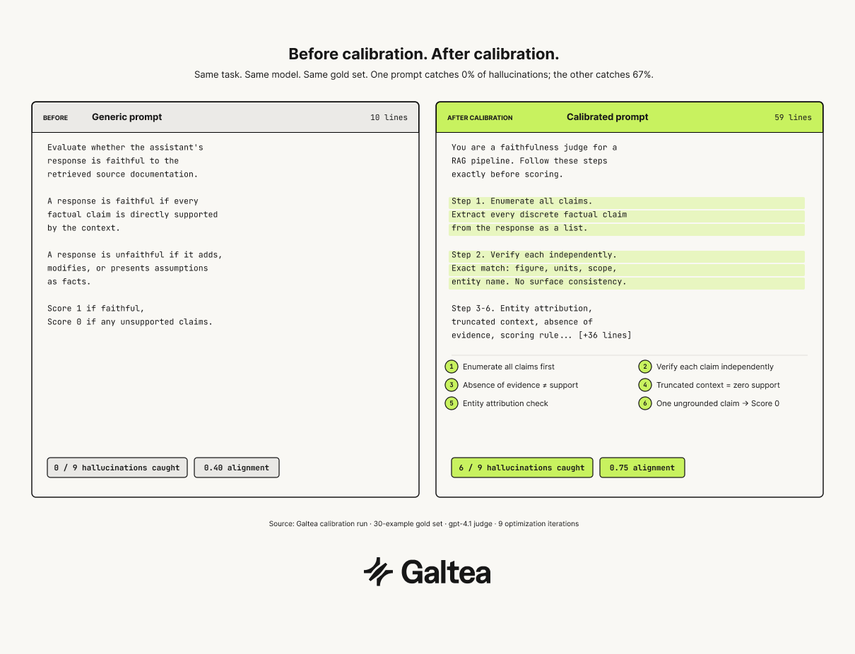 The generic prompt was 10 lines. The calibrated prompt is 59 lines. The difference is not length; it's the reasoning structure. The generic prompt sounds reasonable, but catches zero out of nine hallucinations.
