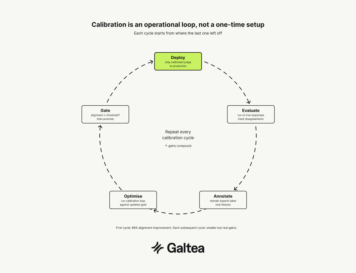 A calibrated judge degrades. As the system under evaluation improves, the output distribution shifts, and the judge will encounter examples outside the range it was calibrated on. Treat calibration as an operational loop: evaluate, annotate disagreements, optimize, deploy, re-annotate remaining failures, repeat.