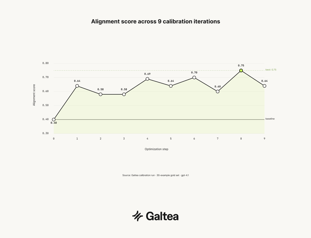 In one calibration run on a 30-example golden dataset, the optimization loop ran nine iterations before stabilising: